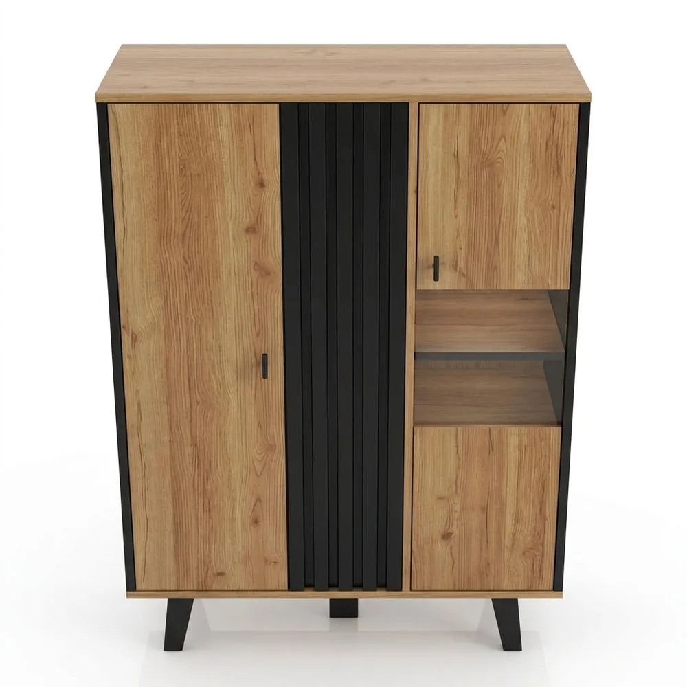 Este mueble ofrece un diseño que combina la belleza moderna con la estética natural. Mide 80 x 120 x 40 cm y cuenta con estanterías detrás de las dos puertas para almacenamiento. La iluminación LED interior resalta los objetos exhibidos. La combinación de tonos de madera y negro ofrece un diseño que se ajusta a cualquier espacio.