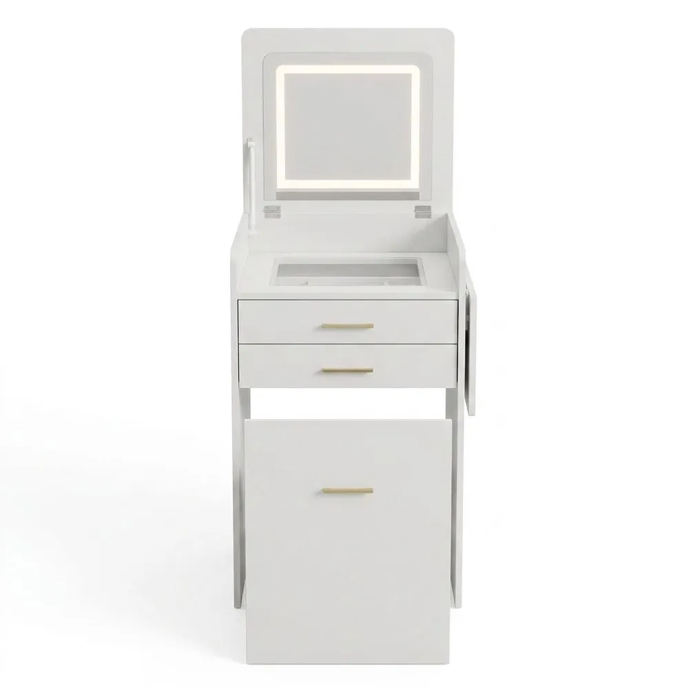 Los paneles laterales permiten cambiar instantáneamente la disposición del espacio, expandiendo la superficie de trabajo para guardar secadores, perfumes o libros.
