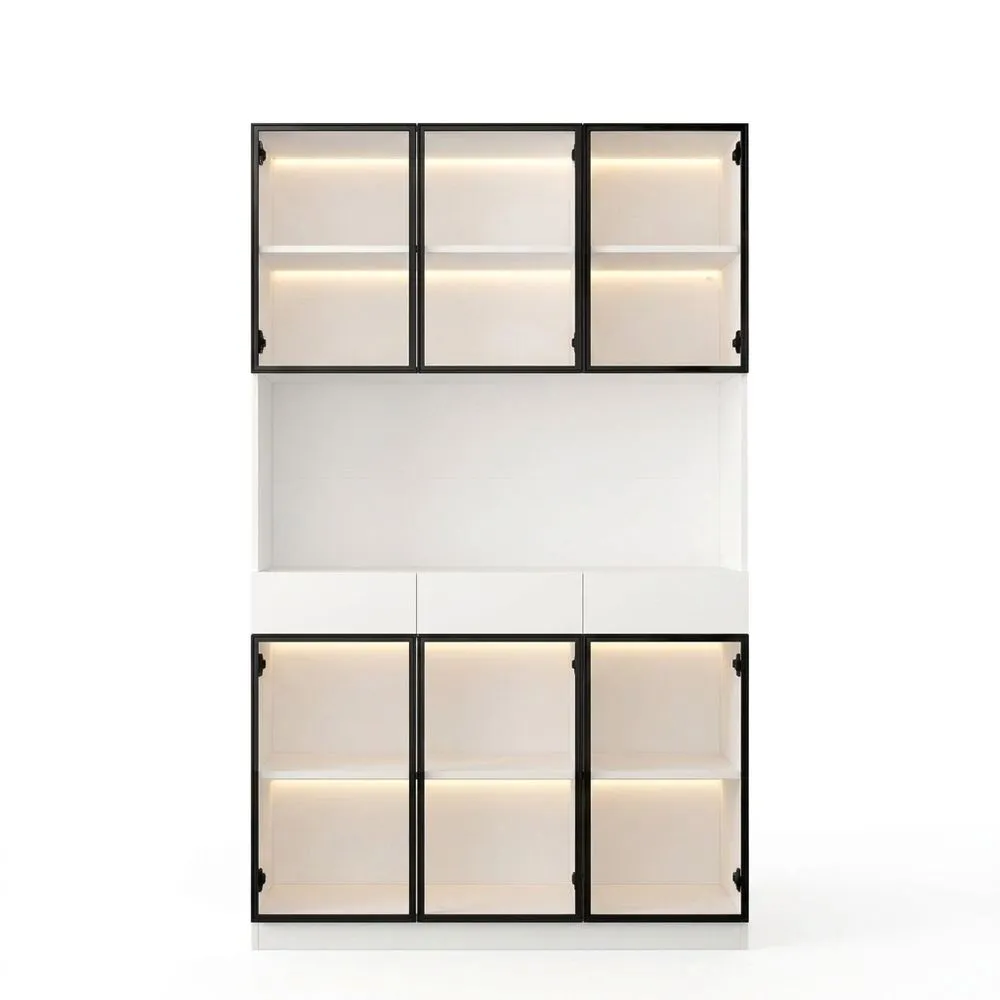 Vitrina alta de cristal con luces LED, ideal para almacenar y mostrar objetos en diferentes espacios como comedor, cocina, sala de estar, dormitorio y entrada. Incorpora un área de escritorio central que permite su uso como espacio de trabajo. La vitrina incluye tiras de luces LED y espacio de almacenamiento oculto, con tres cajones centrales. Construida con tablero de partículas garantiza estabilidad y larga duración. Las secciones superiores e inferiores cuentan con puertas para almacenamiento adicional. Dimensiones del espacio de almacenamiento: 79.5 x 69.5 x 36 cm para la puerta doble y 39.5 x 60.5 x 36 cm para la puerta simple. Cajón central de 29 x 33 x 8.5 cm. Altura mínima desde el suelo de 7 cm, facilitando la limpieza.