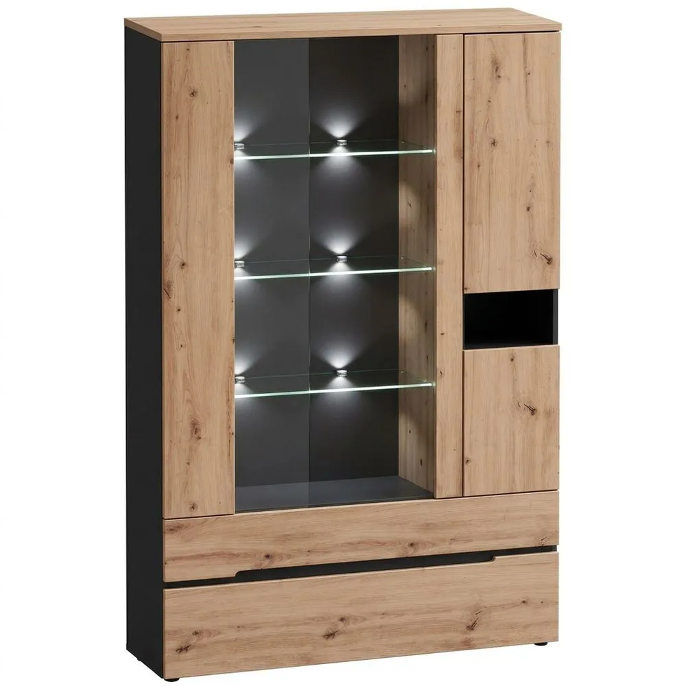 Dos cajones y los compartimentos detrás de las puertas de cristal y madera ofrecen espacio de almacenamiento para diversas cosas. Un compartimento abierto ofrece espacio para decoración y complementa el diseño. El armario está equipado con iluminación LED blanca.